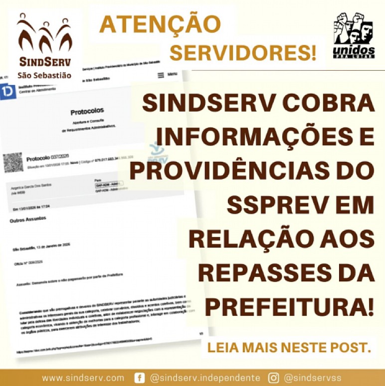 O Sindserv São Sebastião protocolou ofício 08/2026 no Instituto São Sebastião Prev (SSPREV) cobrando esclarecimentos e posicionamento urgentes diante das informações divulgadas sobre o não repasse de valores da Prefeitura ao Instituto de Previdência.