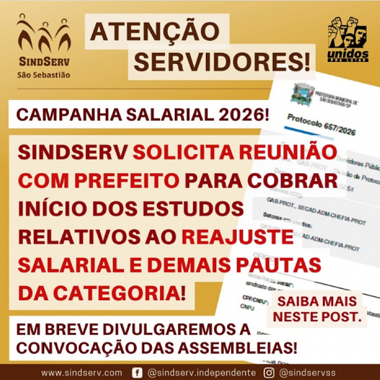 O SINDSERV São Sebastião protocolou o Ofício nº 09/2026, solicitando reunião com o Prefeito Municipal para dar início ao diálogo da Campanha Salarial 2026.